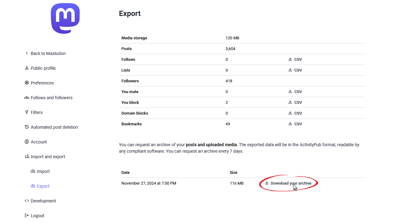 # Migrating means that all of your old followers will automatically follow your new mastodon account instead of your old one. They don’t even have to do anything. But this does NOT copy all of your old posts. If you uploaded a bunch of pictures and forgot to back them up, you can “Download your archive” from the old mastodon instance.