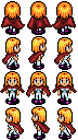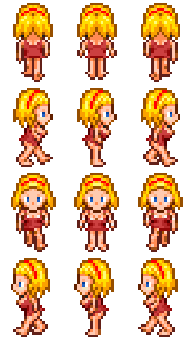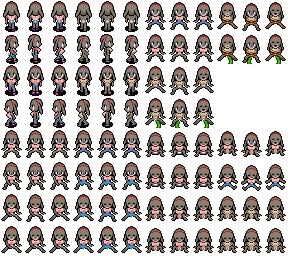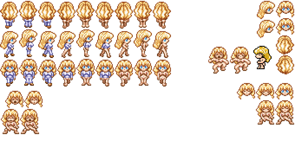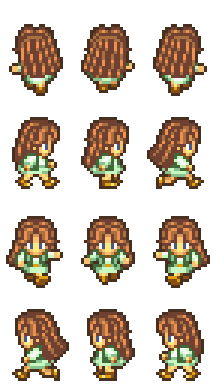 # Her sprite has a bizarre history. I was looking for a shy character and eventually stumbled across something suitable in an old Dante 98 RPG Maker sprite sheet I found somewhere. I don’t really know anything about it. These might be official sprites or fan-made. Dante 98 is a very old program so even after changing the outfit, my version of the sprite still looked primitive. Later on a nice fan called Meesh re-made her sprite from scratch and I’ve used that one ever since. He also created this pose, which I absolutely love.