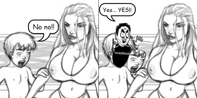 # But comparing the two approaches, there is actually a surprising amount of similarity between them. So in theory I could make slight adjustments to a straight-shota story to make it more fun for an audience that likes boys. Just show the boy’s horny reactions more and make sure he is happy at the end. I could also make the loli story more fun for a female audience by making the girl struggle more at first. The only other difference is how human the aggressors look. I have a personal hang-up where I can’t stand seeing grown men pursuing girls, so I always use animals instead, but in theory a more human looking male aggressor might be fun eye-candy for some people.
