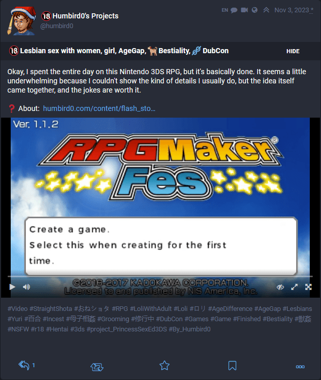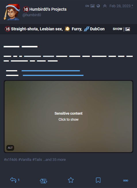When I post my projects on social media like Mastodon, I need to label things differently, because content warnings are not just used for sexual stuff. A person scrolling down a social media feed needs more information. NSFW could refer to any number of other things. It could be something violent, heart-wrenching, polarizing, or just tiresome internet drama. So first I need to point out that my post is sexual content. Then point out any major kinks involved. And then the genders portrayed.