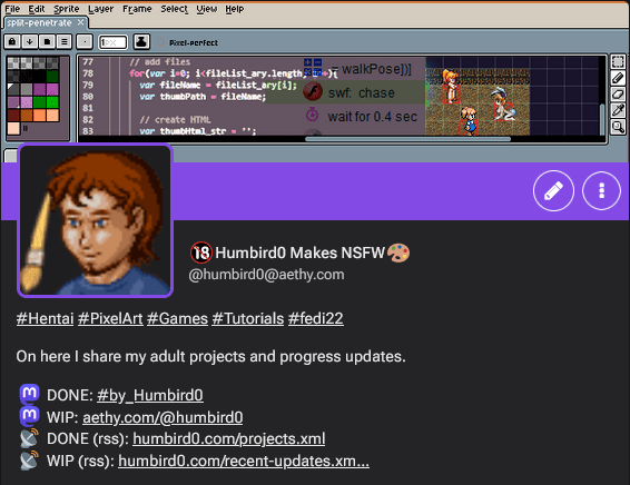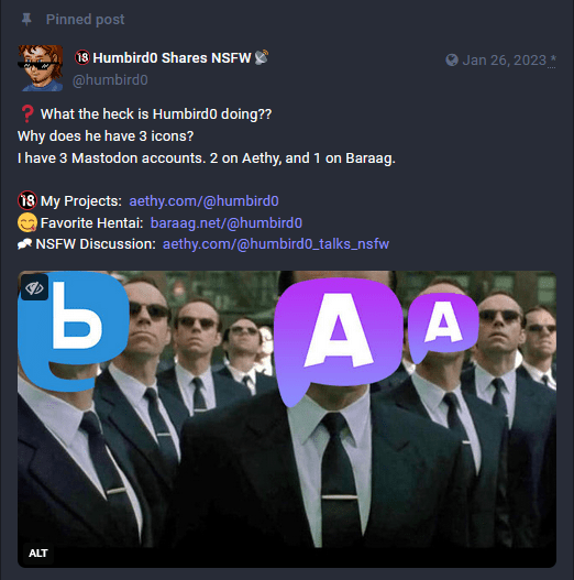 # It turns out that Aethy suits me better. They require everyone to label their posts. I was already doing that. My website was already doing that. I have very strong opinions about this. I believe porn needs to be well labeled so people can actually find stuff they like… or at least filter it. This also makes a lot of sense on a federated system.