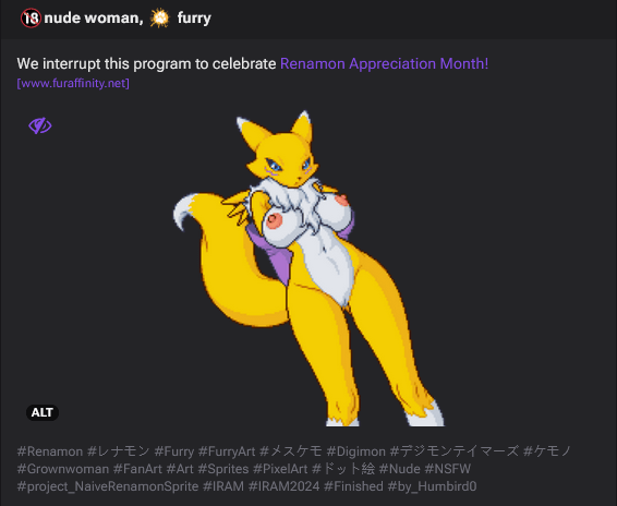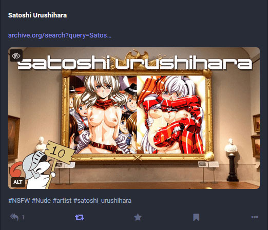 # But now I have 2 mastodon accounts. So what do I do with the Baraag account? I don’t want to delete it because I still follow some of the artists on there. But if Baraag has to defederate to save bandwidth again I’ll miss out. I also want to share awesome lewd art from other artists. But nobody on there ever bothers to hide anything with Content Warnings so most other mastodon instances tend to block posts from Baraag, so I can’t really share posts from there… but I can share lewd posts to there. Clearly nobody on Baraag minds, so that’s what that account is for. Recommending art and artists.
