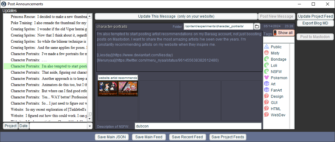 # I don’t think I use social media the way most people do. Even when I first signed up for Twitter way back in 2013, I created my account for a very specific purpose, to post progress updates about my projects. But why Twitter? Because I could post the messages using my phone, even if I was at work. My Pokemon Hentai game project had a dedicated forum thread, but I had a bad habit of going silent for months at a time and not telling anybody how the project was going. Part of this was because I didn’t have much free time back then, so I wanted to post a quick message using my Phone right before work. But forums don’t really work well on phones. Forum software was designed in the early 2000’s for desktop computers.