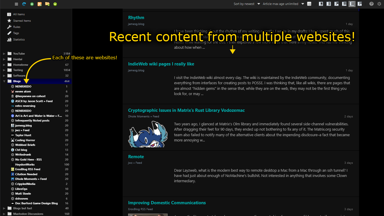 # It’s also possible to follow entire websites instead of people. It’s called an RSS feed. If ign.com posts an article you can see it show up in a simple list. YouTube and Mastodon also have RSS feeds, so you can follow YouTube channels and see what people post on Mastodon this way. This means you can instantly see whether or not there’s anything new. If the list is empty then you don’t have to waste your time manually visiting the site itself to check. You can even combine these lists and check multiple sites all at once.