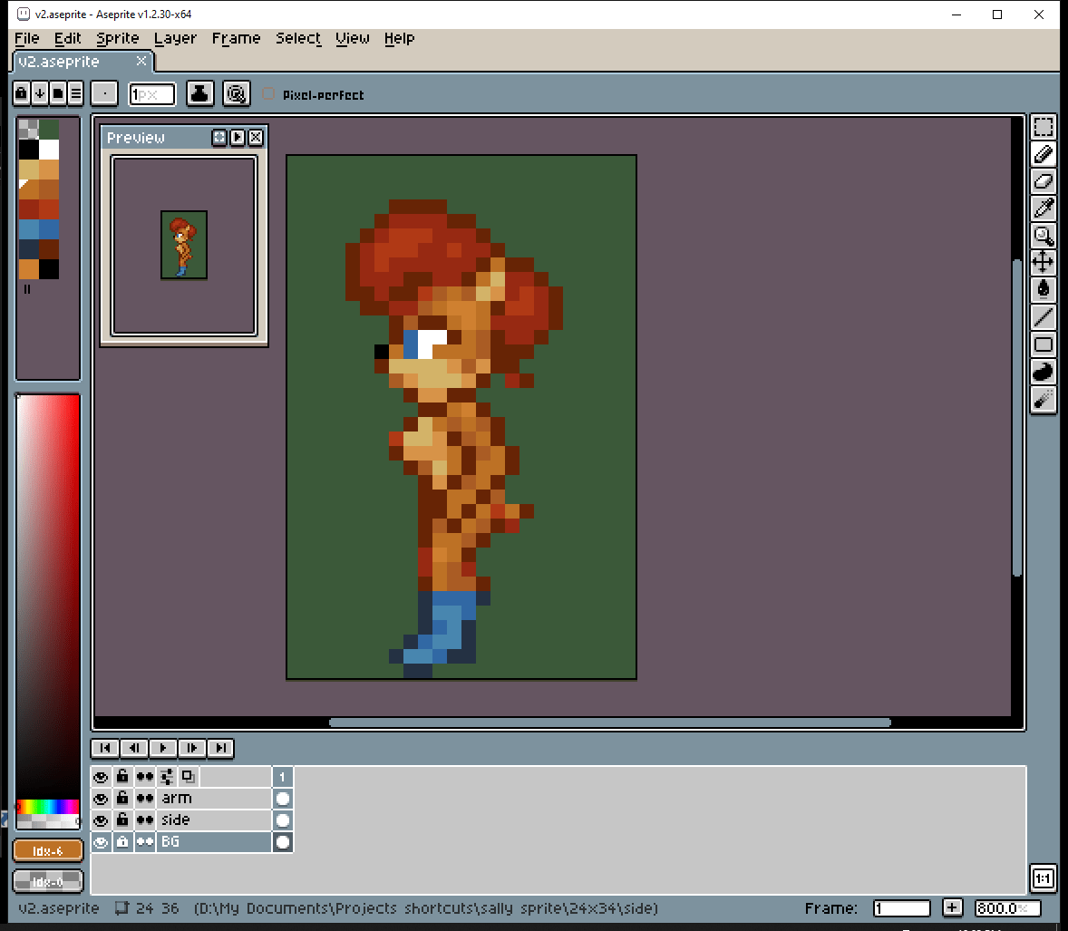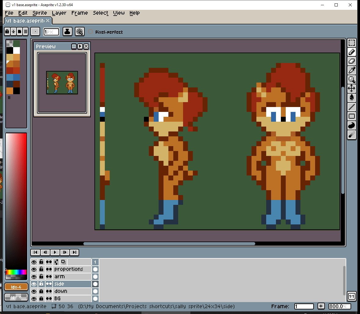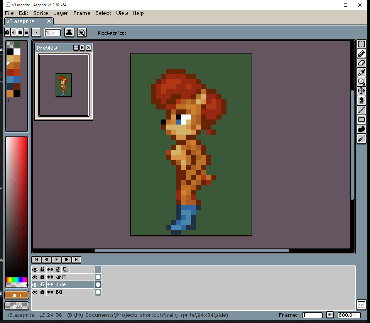 # But then I had an idea. Draw a thin line of pixels, with the colors of important details. I can put this line right next to the side view while I’m making it. I think this technique worked pretty well.