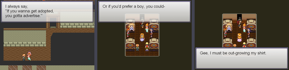 This was inspired by another story I was making. Marle kept losing her shirt and it was such a fun concept I just had to make a story around it. But after I finished making the Princess’s first batch of mischief, I had to think awhile before anything resembling a plot came to mind. The ending was the hardest part to figure out. It took a few brainstorming sessions before I came up with a satisfying ending. Ironically, the final montage through the town was actually the easiest part to figure out. Just take all the remaining loose ends and show what happens to each character.