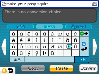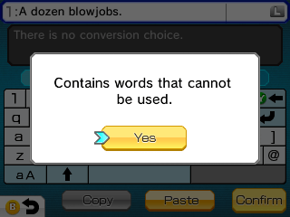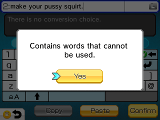 The 3DS version does try to block some naughty words, but wow… they’re still making this way too easy for me. All I have to do is add a period to make it accept most words. C’mon, at least give me a challenge!
