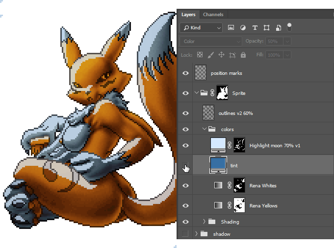 Finally I said “Screw it” and went back to good ‘ol reliable Gradient Maps and then just threw a bluish color tint on top of everything. Let Photoshop figure out how to mix warm and cool colors at the same time. Besides, Renamon just looks weird without her white areas. So… not completely monochromatic.