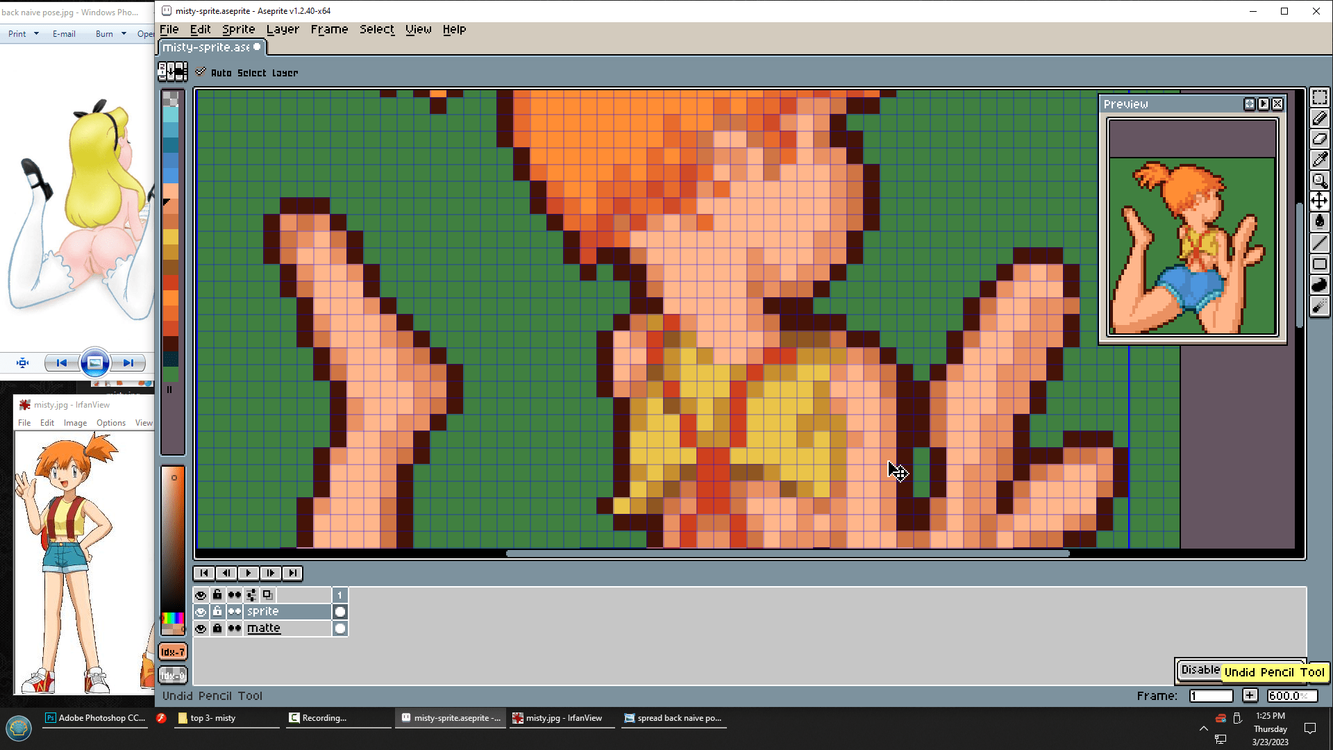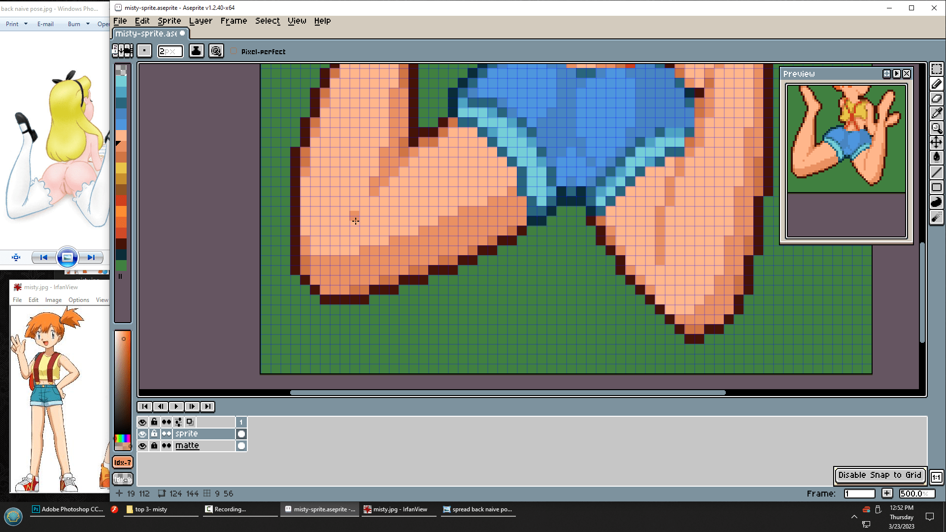 I think I’ll aim for about double my usual in-game sprite size, so instead of 32 pixels tall, this will be about 64 pixels tall. Let’s just add a few general details to turn it into Misty first.