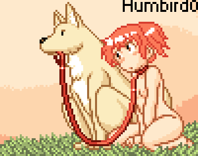 I was thinking about the dubious ethics of me using other people’s pictures for the titles of my Flash stories, and I wondered how practical it would be to draw my own title screens, or at least my own thumbnails. So as a test I tried redrawing the thumbnail I used for my Dog’s Pet story. To hopefully save time, I skipped using vectors and just decided to wing-it by tracing outlines over a scaled-down picture, which is tricky to do. Making this pixel-art still took over 5 hours. Which is not too bad considering that it’s 100x80 pixels in size and contains 2 characters.