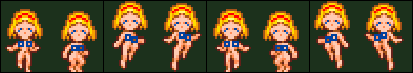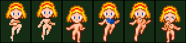 After awhile I stumbled across this amazing animation tutorial by Felix Sputnik about how to animate a skipping character. And while I didn’t use his exact poses due to the size of my sprite and the limited number of animation frames, he did have some good insights about timing and the way the body will act like a giant spring. Besides, I gotta respect an animator who’s not afraid to put so much casual nudity in his works, and his skill is astounding!