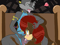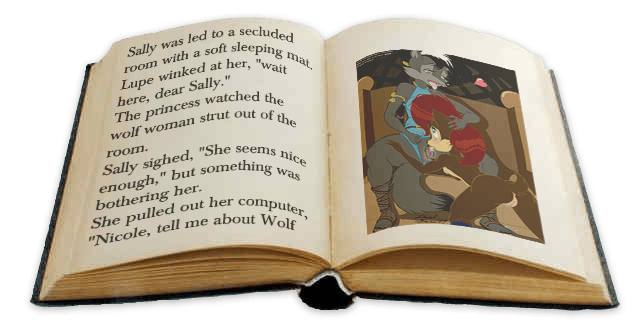 F/F Lupe/Sally ==================== Somewhere within the canyons of the great unknown, a howl broke out. It echoed through the caves of no return. Sitting around the incense of the meeting room, a couple of wolf pack freedom fighters grinned. They knew this sound. Lupe collapsed on her sleeping mat as the orgasm subsided. Licking her lips, her thoughts were filled with the curves of that beautiful woman. "Sally" she panted. Back at knothole, a carrier pigeon-bot arrived at Sally's window. Sally pulled her chair back from the table. But before she even finished standing, Sonic raced over to the window and grabbed the letter the bot was carrying. "Borrring!" He complained. "Then it's probably not for you", said Sally, who sat back down, "and probably something important." "Hey, my fan mail's important too," said Sonic as he basketball-tossed the note onto the table. Sally caught it as it bounced and uncrumpled it. "Sonic, this is the alliance treaty I sent to the northern freedom fighters," she groaned, "well, at least I can still make out Arnie's signature." The hedgehog shrugged, "what's the deal with all these papers, Sal? We're already on the same side." "We all have to be on the same page, Sonic," said Sally as she carefully folded the document. "Same... Page? What, do we need a book to fight Robuttnik or something?" Sally grinned and shook her head, "working together can mean different things to different people." She pulled out her portable computer, "Nicole, did my letter reach the wolf pack yet?" "Scanning..." The princess waited. "No response from carrier-bot, Sally." Reported the computer. "Huh? Why not?" Sonic yawned, "probably got lost in all those caves." 'records indicate the carrier's last known position was quadrant 3-4 of the great unknown." "I was afraid of that," Sally sighed and grabbed her backpack. "Afraid of what? Hey, where are you going?" The hedgehog followed the princess outside. "There's always a freak storm in that area," she explained, "so a letter has no chance of getting through, unless..." "Unless what?" Sally whistled for Dulcy, "I have to visit Lupe." An alarm buzzed, breaking Lupe's meditation. "There's someone in the canyon!" One of the wolves grabbed a spear. "Hold, Dorgo!" The wolf woman stood, "observation comes before action," she turned her attention to a different wolf, "You... Go scout the entrances." Dorgo put down his spear, "I see that your heat has not clouded your judgment." Lupe took a deep breath, "Perhaps the meditation is working after all." But when Sally walked into the meeting room, a familiar tingling immediately erupted between Lupe's thighs. "The Wolf Pack welcomes you, S-Sally Acorn." "Thank you," replied the Acorn princess as she sat cross-legged on the other side of the fire pit. "My messages haven't been getting through," she explained. The wolf woman nodded, "Nothing crosses Storm Valley. But we have other ways of sending messages." Sally passed a document to Dorgo, who passed it around to Lupe. "Y-You wish to form an... alliance with me?" The princess nodded, "We share the same needs... and a common threat." "I-Indeed..." The woman was grateful her visitor could not see the small wet spot forming on her leotard, "But... are you sure about this proposal, Princess? An alliance-" "-makes perfect sense," concluded Sally. For a moment, Lupe looked deep into the princess's eyes. Then she smiled, "yes... yes, it makes sense to me as well." "That's great!" Sally reached for the pen in her vest. "However!" added Lupe, "I must consult with The Pack first." Dorgo stood, "This way, princess." A moment later he returned, "This seems strange to me." Another wolf spoke up, "Don't the customs of her royal family require alliances to be formed though... marriage?" "Indeed they do," agreed Lupe, trying to ignore the obvious dampness between her legs. The wolf next to Lupe spoke up, "Have you truly thought this through? Your heat might be influencing your thoughts." "I-I have it... under control, Sanji." Panted Lupe. Dorgo sat by Lupe, "Perhaps that freedom fighter does not realize what she is asking." "She knows... She must," replied Lupe, "After all, she is the princess of the Acorn family. She knows her own customs better than anybody." "Then this is cause for celebration," said Sanji, "The Princess herself has proposed to you, Lupe!" Dorgo grumbled, "After only meeting you twice." "And I accept," Lupe stood. When Princess Sally returned, she was surprised to see Lupe wearing a headdress of flowers. "I hereby accept the proposal. Let us prepare for the ceremony." A similar headdress was placed on Sally's head. "Um, a whole ceremony?" She asked, "I had no plans to impose on your hospitality." "I would be honored to have you, princess," the wolf woman placed a hand on Sally's shoulder, "The Wolf Pack has long honored the traditions of the Acorn kingdom." "Then I'm grateful," Sally couldn't help smiling. These people actually treated her as a princess. Lupe led the hapless woman down a corridor. The Wolf Pack cheered as she followed the other woman. There was a small table at the end of the path. "Ah, that must be the treaty agreement," mumbled Sally. The princess confidently leaned over the desk, "Okay, where do I sign?" Lupe placed a warm hand upon hers, "These are the sacred writings of my people. Our ancestors bear witness to every union." "Oh." Sally quickly stood up. Lupe still held her hand, "From today forward, the Knothole freedom fighters and the Wolf Pack are one. Our land is your home. Your land is my home." The wolf woman picked up Sally's other hand, "From today forward, we are one. You are mine..." A pause. Sally spoke up, "a-and you are mine." Then without warning, Sally suddenly felt Lupe's lips pressed against her mouth. The kiss took her completely by surprise. The squirrel stared blankly as the wolf woman raised their hands to the ceiling. The crowd cheered as the two women left through a curtained passageway. Sally was led