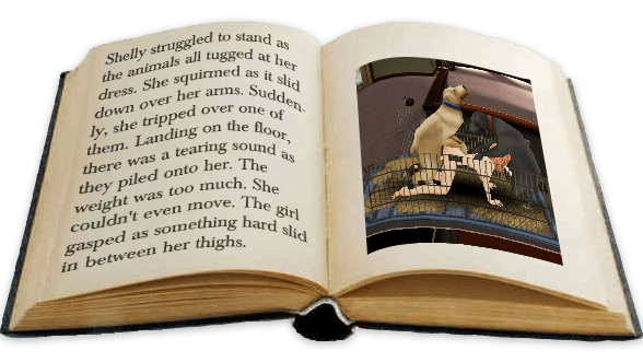 Animal/f F/m ==================== "How would you like to make some money?" The Shelly's eyes lit up, "Hell yeah!" The petshop owner chuckled. Maybe this young girl wasn't too modest for this after all. A moment later, Rebecca returned with an animal costume, "This is your work uniform." "Cool!" Chirped Shelly, grabbing the skimpy clothes. "The owner has to leave for a few hours so your job is to guard the shop until he gets back." Explained Rebecca, suppressing a mischevious grin. "No problem! Being a guard sounds easy." Nodding, Rebecca stepped outside, locking the door behind her. Inside, a bunny pawed eagerly at its cage as it watched the busty girl undressing. "I think my uniform's too small" mumbled Shelly as she tried to pull the short skirt lower. As she tugged, her breasts suddenly popped over the top of the brown dress. She shrugged as she yanked it up. It wasn't like anybody would see her anyway. Outside, Rebecca passed out binoculars to the people who passed by. "Aye, come one, come all!" Bellowed the shop owner, "Feast yer eyes on all the cute critters in me shop!" Meanwhile, Rebecca led a mother and her son up the hill for a better view. "Woah, that chick is hot!" Gasped the boy as he focused on the window. "Yes, it's quite a show," his mother chuckled, "Rebecca, you never disappoint, do you." Rebecca pulled out a remote, "You ain't seen nothing yet!" She pushed a button. There was a faint click behind Shelly as she sat, bored, behind the desk. Behind her, an overjoyed bunny hopped out of its cage. She lay her head down. This was easy work, but it was boring work. The girl began snoring as the bunny peered up her dress. "Ooh, you might want to see this, hun." Said the mother as she passed the binoculars back to her son. "Really? What's happening?" He asked, peeking through them. "Remember last night, when I was talking about intercourse?" She pointed, "You're about to see it." Shelly groaned as the seat shook. The bunny stared at the two melons over its head. Standing up on its hind legs, it pawed at her shirt. "It's pulling down her shirt." Whispered the boy. His mother hugged him, "She's going to get nursed," she giggled, "Tell me what else you see." He adjusted the focus, "I see her boobs!" The bunny nuzzled the girl's breasts. Shelly sighed in her sleep as it found one of her nipples. Happily, it began suckling. Her legs began to tingle. The boy fidgeted in his mother's lap, "I think it's drinking her milk." The woman reached down in front of him, "I bet he's hungry for more than just milk." Shelly leaned back in the chair. It was nice and warm here... Almost as if she had a soft blanket on top of her. Well... Mostly soft. "Let me help you with that," said the mother, unzipping the boy's pants. "That bunny's doing something funny, mom," she peeked through the binoculars. The animal lay on top of the girl, rocking back and forth. "It's mating with her, hun." He looked up at her, "What's that?" She smiled at him, "It feels sort of like this," she said, wrapping her fingers around his shaft. Shelly heard wet squishing noises as she opened her eyes. "Hey, it's a bunny! How cuuuute!" The girl suddenly noticed she was shaking. No... Being shaken by something. The bunny slid off her as she stood up. Something hot dripped between her legs. "Hey, where are my underpants?" Suddenly, she heard a dozen clicking sounds behind her. Turning around, she gasped, "All of the rabbits had gotten free." The boy leaned back against his mother's breasts, "Woah! A bunch of bunnies just jumped on top of her!" The woman continued fondling her son, "That's nice, hun," "Are they all going to mate with her?" He asked, excited. "Yeah," she grinned, looking through the binoculars, "They're going to fuck her silly." Shelly struggled to stand as the animals all tugged at her dress. She squirmed as it slid down over her arms. Suddenly, she tripped over one of them. Landing on the floor, there was a tearing sound as they piled onto her. The weight was too much. She couldn't even move. The girl gasped as something hard slid in between her thighs. "They're all doing her now," gasped the boy. His mother didn't say anything. She just continued sucking. Shelly's cheeks burned. Whatever they were doing, it felt really really good! There was another click. Suddenly, all the bunnies scrambled away. "W-wait! Don't -pant- don't stop..." Begged Shelly, grabbing one of them by the tail. Just then, she heard a deep panting behind her. Before she could react, the dog pressed its large paws down on her back, forcing her to the floor. Something very large poked against her pussy. The girl's legs shook as the giant shaft sunk deep into her. Then it stopped. She didn't think it could go any further. It felt like she was pinned. Shelly tried forcing her legs together. But couldn't. Her pussy squeezed tight around the beast's cock. Then it slowly began to pull out. The girl moaned. She could feel every inch of it moving inside her. Just as the head reached her enterance, the creature leaned forward, suddenly shoving the entire length into her. To Shelly's surprise, it slid in easily. She was very wet. Catching her breath, the girl felt something odd. The base seemed to be expanding. As it pushed tight against her folds, she began to get a little worried. She quirmed under the dog's weight. Then it began to move... Fast. The huge shaft slid in and out, pumping her pussy relentlessly. She could feel her own juices running down her thighs. Her entire body burned from the delicious sensation. The girl arched her back. But even this orgasm wasn't going to slow this beast down. Giving up, she rested her cheek on the floor. She didn't know how many times she was going to cum, but she couldn't escape. Shelly licked the air as her next wave approached. From a safe distance, the rabbits watched her juices spurt out. Patiently, they waited, ready to jump in as soon as the large dog was done with her. She wasn't going to get a break. Th