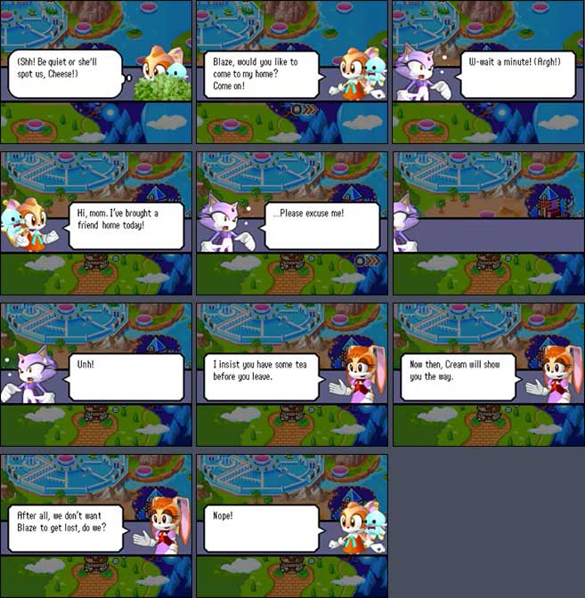 "Oh, are you looking for Tails?" asked the rabbit, "Come inside. I think he's hiding around here somewhere."