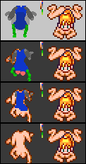 But don’t fill in the fully-filled grid tiles until after you’re done outlining, because trying to fill too soon will distract you from the task of drawing the outline itself. Another rule-of-thumb is I also prefer to only let the two darkest colors touch the background. This means that I outline any lighter colors with dark pixels, and just treat those colors as inner details instead of the outline. After outlining and filling the sprite, I like to add additional detailing, shadows, and smoothing to the inner parts of the outline using the 2nd lightest color. Every animation frame should be outlined and filled from scratch. As long as you follow the same outlining rules you’ll end up with nice consistent results, and the subtle details of the original double-size sprite will be mostly preserved. Here’s a narrated video demonstrating the whole process.