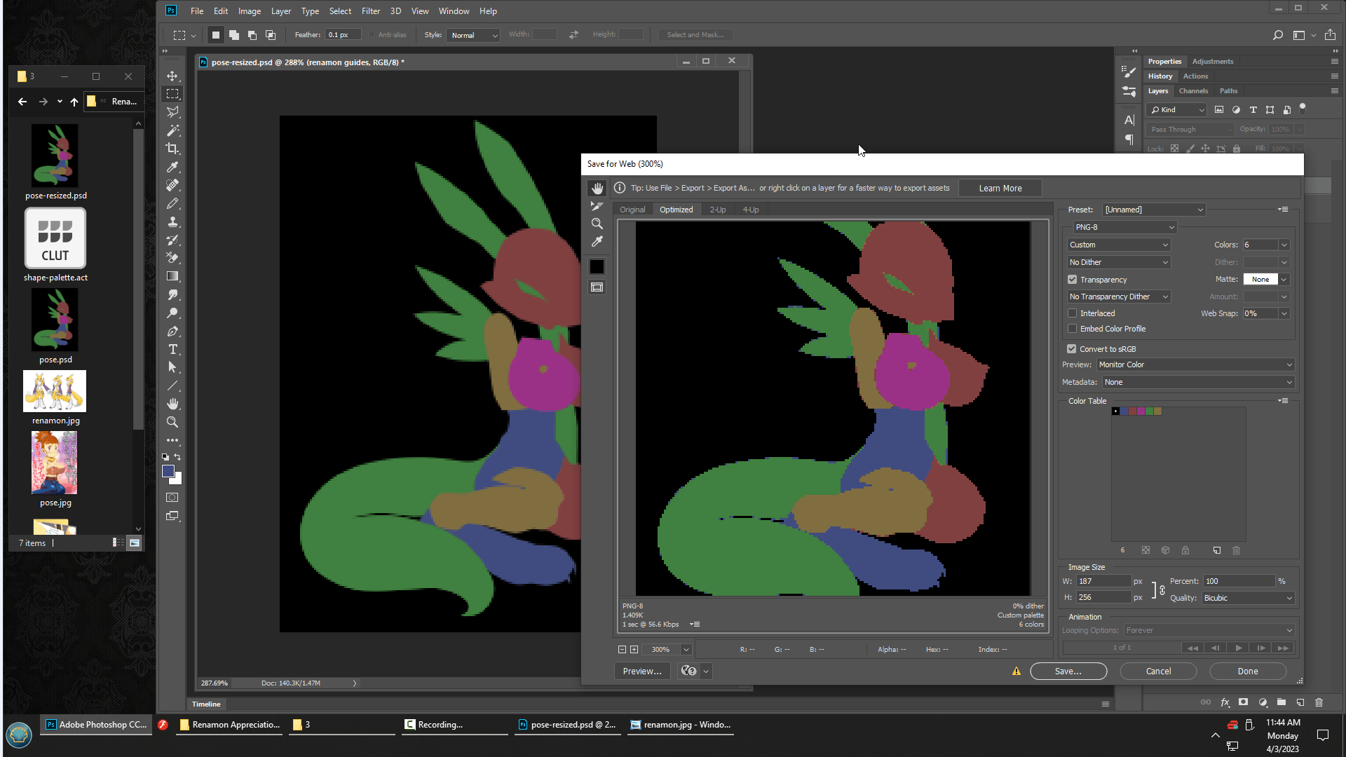# Then I fill those vector shapes with colors that deliberately contrast with each other and convert the picture to a very tiny palette with only those colors. This (mostly) discourages Photoshop from blending the pixels which creates hard aliased edges. This will be useful soon.