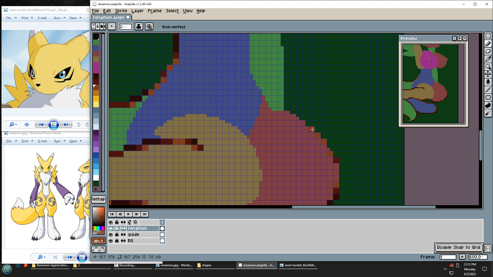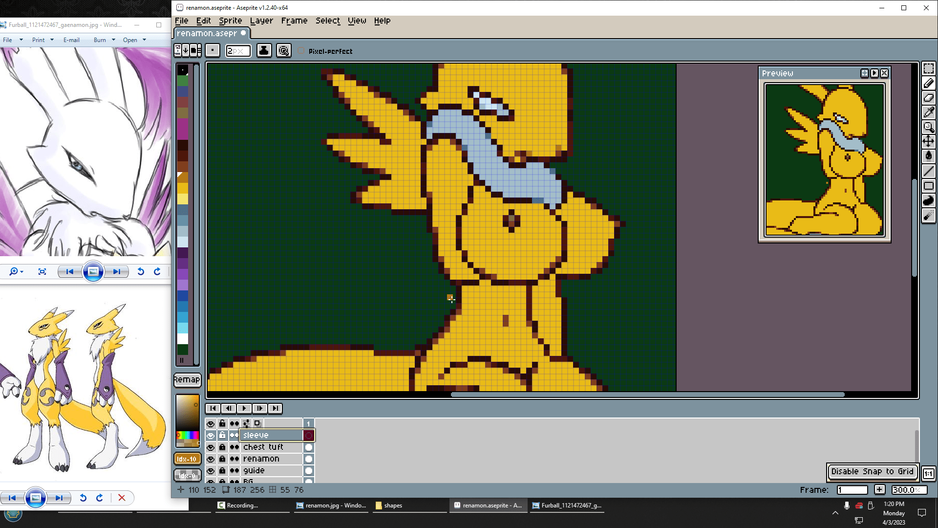 In this video, you might notice moments when pixels are flickering back and forth. The video is playing at 8x speed, and I occasionally look at a tiny preview of the sprite and toggle the changes back and forth trying to decide if the changes I just made look better or worse. With sprites, it only matters what they look like at their intended size. (I suppose you could just blur your eyes)