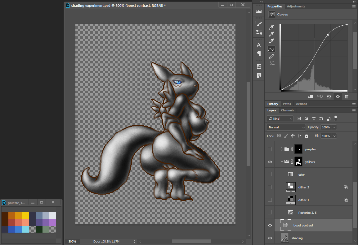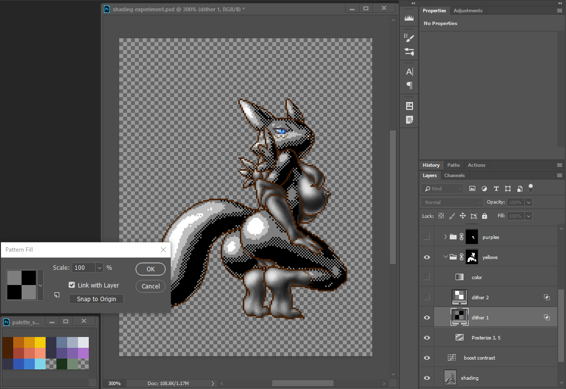 # Adding dithering by hand can take awhile, and relying on software like PixeLover to generate the dithering after you finish shading a picture tends to result in hapazard pixel placement. But there’s a third approach. It is possible to set things up in Photoshop so that you can see the dithering being applied in real-time while you’re shading a picture.