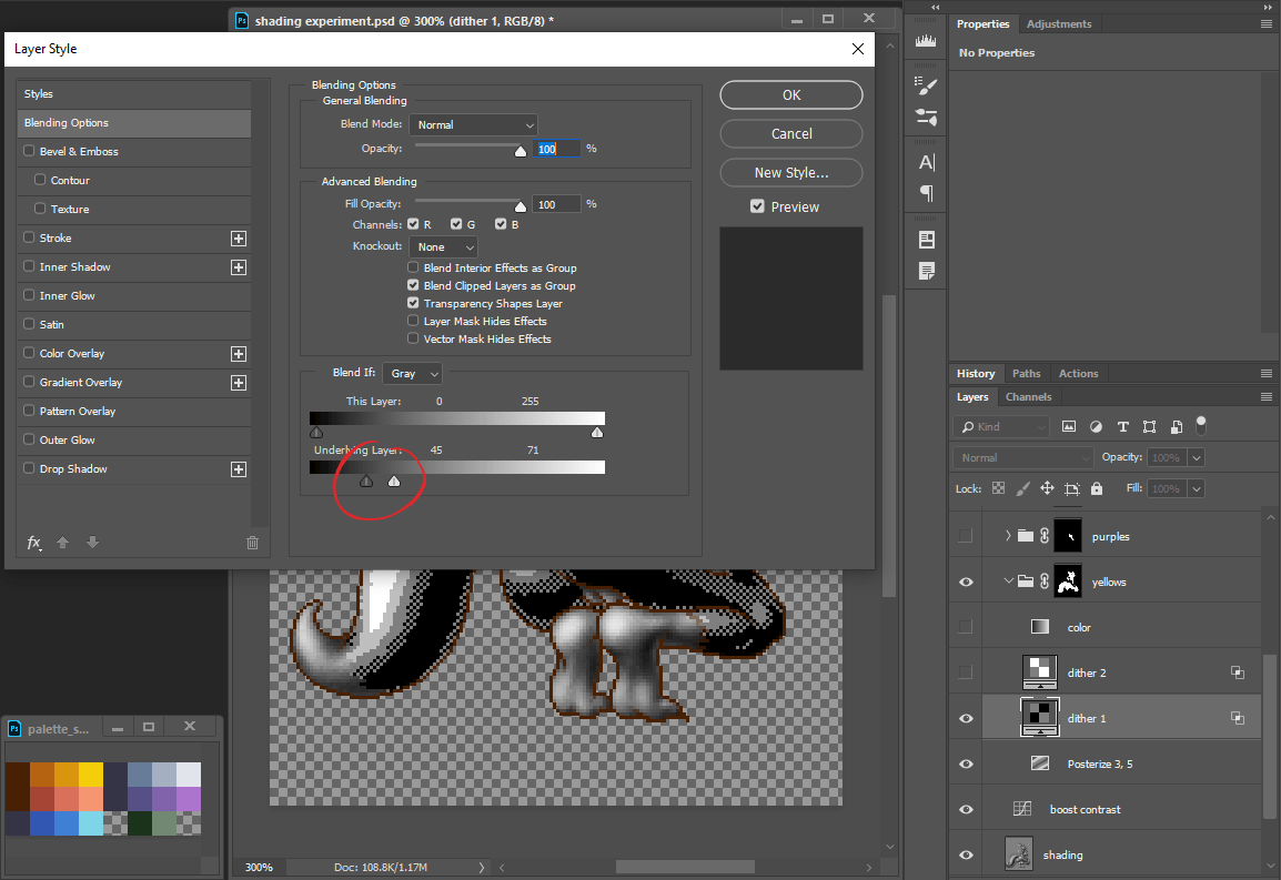 Double-click this layer and change the “Underlying Layer” threshold sliders until the dithering only appears on the band you want it to. In this case I want it to apply between the black and second-darkest gray band.