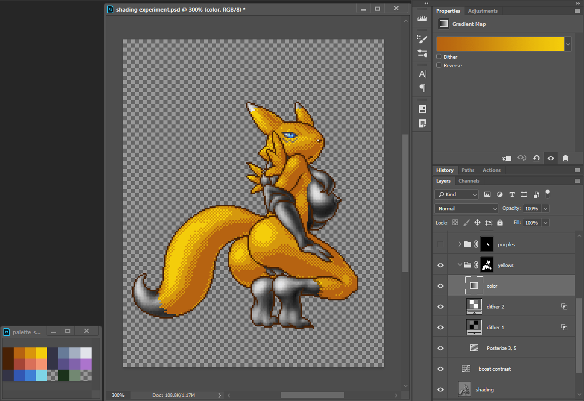 Add posterizing using a layer effect. The goal is to create a brightness band for each shade of this color in your palette AND for each band of dithering in between each of those colors. In this example I have 1 dark color exclusively for outlining and 3 shades of yellow I want to use for shading, so 3 shades of yellow + 2 shades of dithering in between them = 5 total bands.