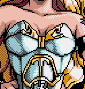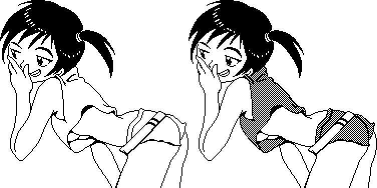 # GB Dot Converter results in broken outlines. You can no longer see the pupils of her eyes. Her fingers are completely lost in a sea of black. You can barely see her nipples. The dithering has ragged edges and spews unnecessary pixels into small areas that don’t need them. But at least the tongue mostly came out well.