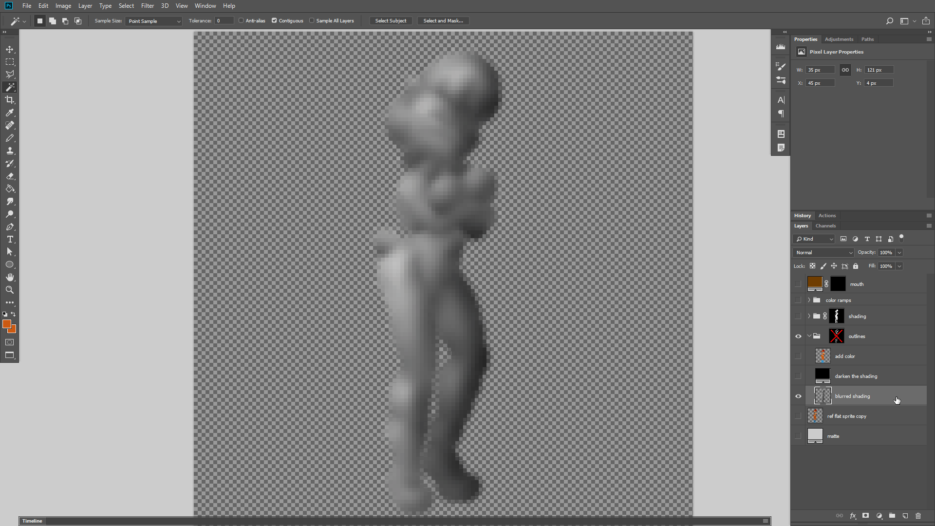 Then you do the same thing with the shading. Blur it to expand it outward. The reason why you use the shading is because we want the outline to be similar in brightness to the pixels inside the sprite, only darker.